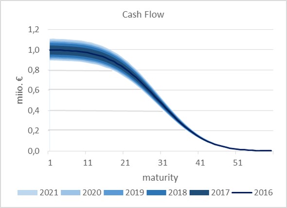 Planning: In our example we assume that the expected cash flows remain largely stable over the planning period. The uncertainties, which are included in the simplifying assumption, will thereby modelled as uniform distributed deviation of ± 2.5% between the forecasted cash of one planning year and the forecasted cash flow of the next planning year. Accordingly, the Monte Carlo simulation provides for each planning year a distribution of cash flows (see figure 2).