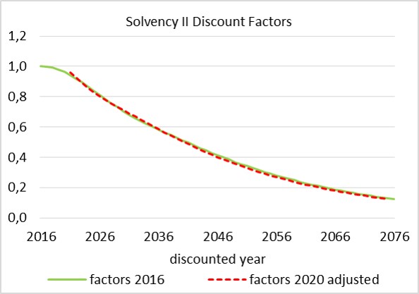 Assuming that the expected interest rates will follow the currently observed yield curve, the Solvency II discount factors will change within the planning period only by the discount factor of the preceding planning years (see figure 1).