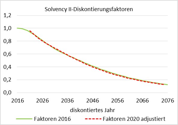 Solvency II-Bewertungen: Prinzipiell beziehen sich die Solvency II-Bewertungen auf den aktuellen Bilanzstichtag und sind nicht für die Planungsrechnung ausgelegt. So wird z.B. die Solvency II-Zinsstrukturkurve aus der aktuell am Markt beobachteten Zinsstrukturkurve abgeleitet. In der Planungsrechnung müssen also zuerst die beobachtbaren Zinsstrukturkurven modelliert und anschließend die Solvency II-Zinsstrukturkurven daraus abgeleitet werden. Unter der Annahme, dass die erwartete Zinsentwicklung der aktuell beobachteten Zinsstrukturkurve folgt, ändern sich die Solvency II-Diskontierungsfaktoren im Verlauf der Planungsjahre nur um den Diskontierungsfaktor des vorangegangenen Planungszeitraumes (siehe Abbildung 1).